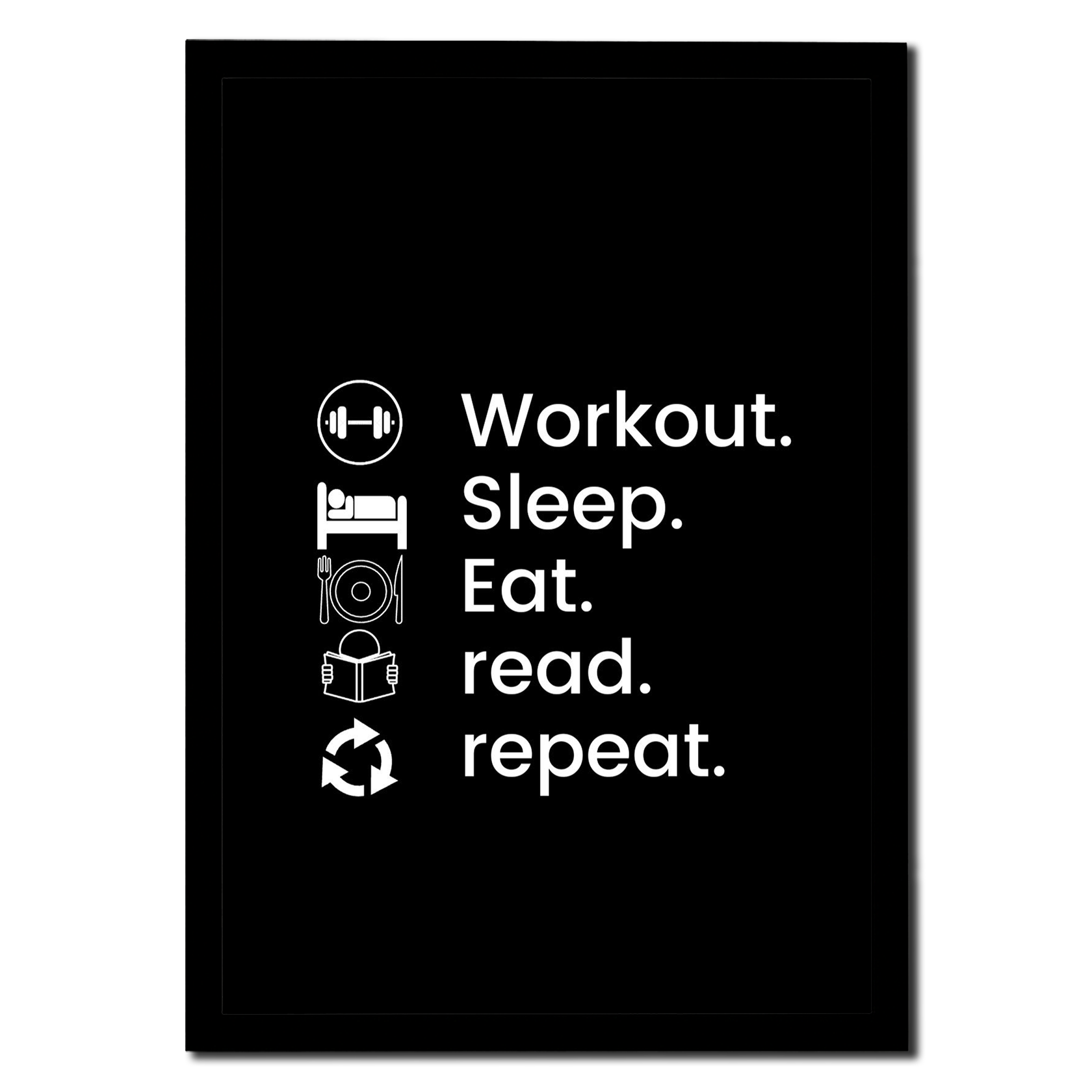 Simple, bold, and motivating—this minimalist print captures the routine of growth: Workout. Sleep. Eat. Read. Repeat. A perfect daily mantra for Workout/Gym driven space.