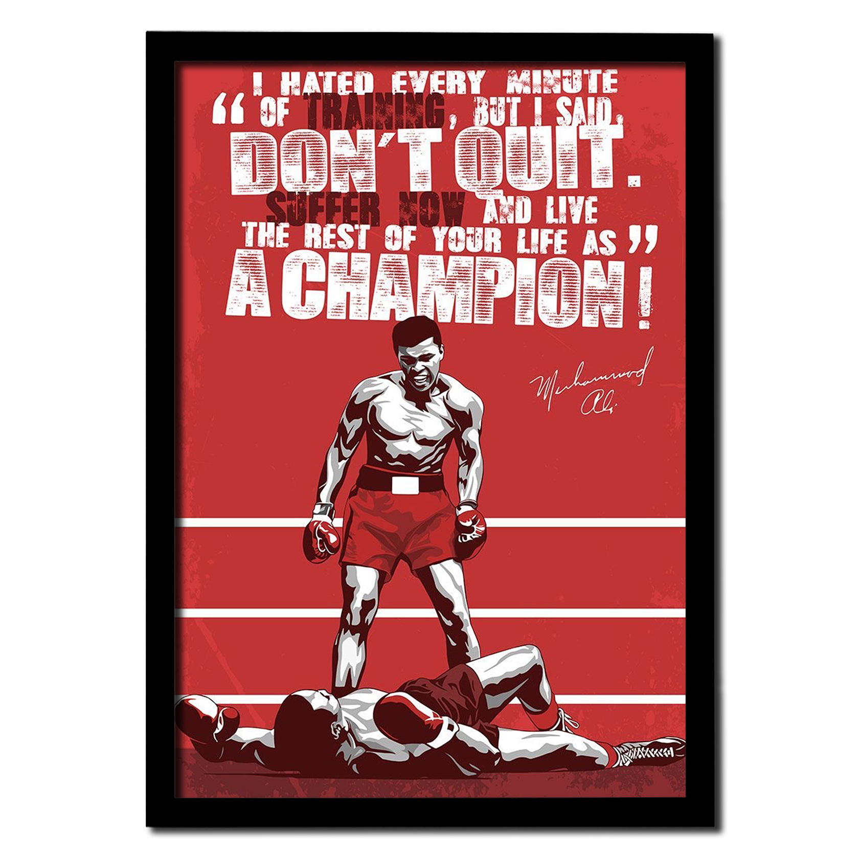 Elevate your space with this powerful Frame featuring Muhammad Ali's iconic quote and victorious stance. A bold red design captures the spirit of determination with the inspiring message: "Don’t quit. Suffer now and live the rest of your life as a champion." Perfect for gyms, offices, or any place that thrives on ambition.