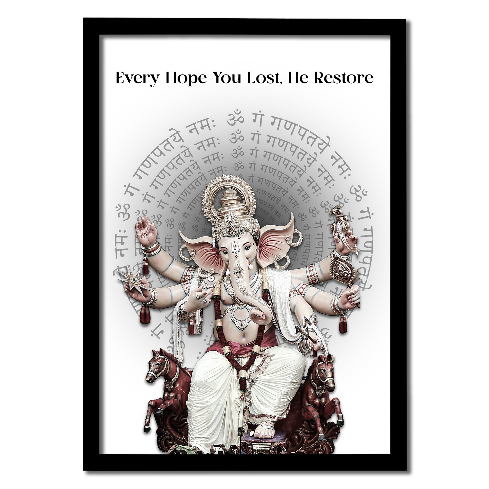 Bring home the divine presence of Restorer of Hope, a majestic wall art of Lord Ganesha in his powerful multi-armed form. Seated gracefully with symbolic weapons and blessings in each hand, this artwork represents protection, wisdom, and the restoration of faith. Behind him, sacred Sanskrit mantras radiate divine vibrations, making the piece deeply spiritual and uplifting. The inscription “Every Hope You Lost, He Restore” beautifully conveys Ganesha’s eternal role as the remover of sorrows and restorer of strength.