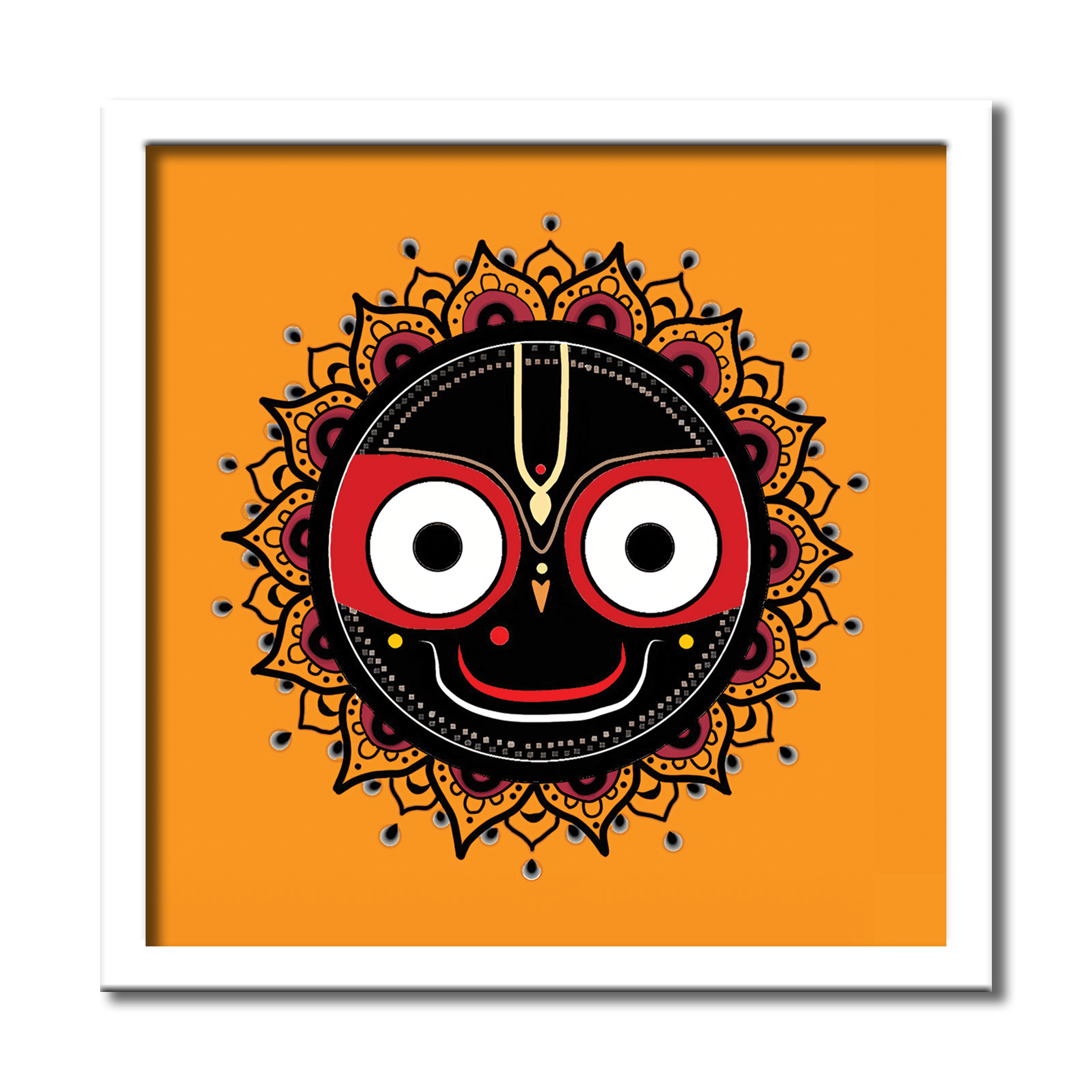 Add a vibrant spiritual touch to your walls with Sacred Aura, a striking wall art piece of Lord Jagannath surrounded by a detailed mandala pattern on a bright orange background.