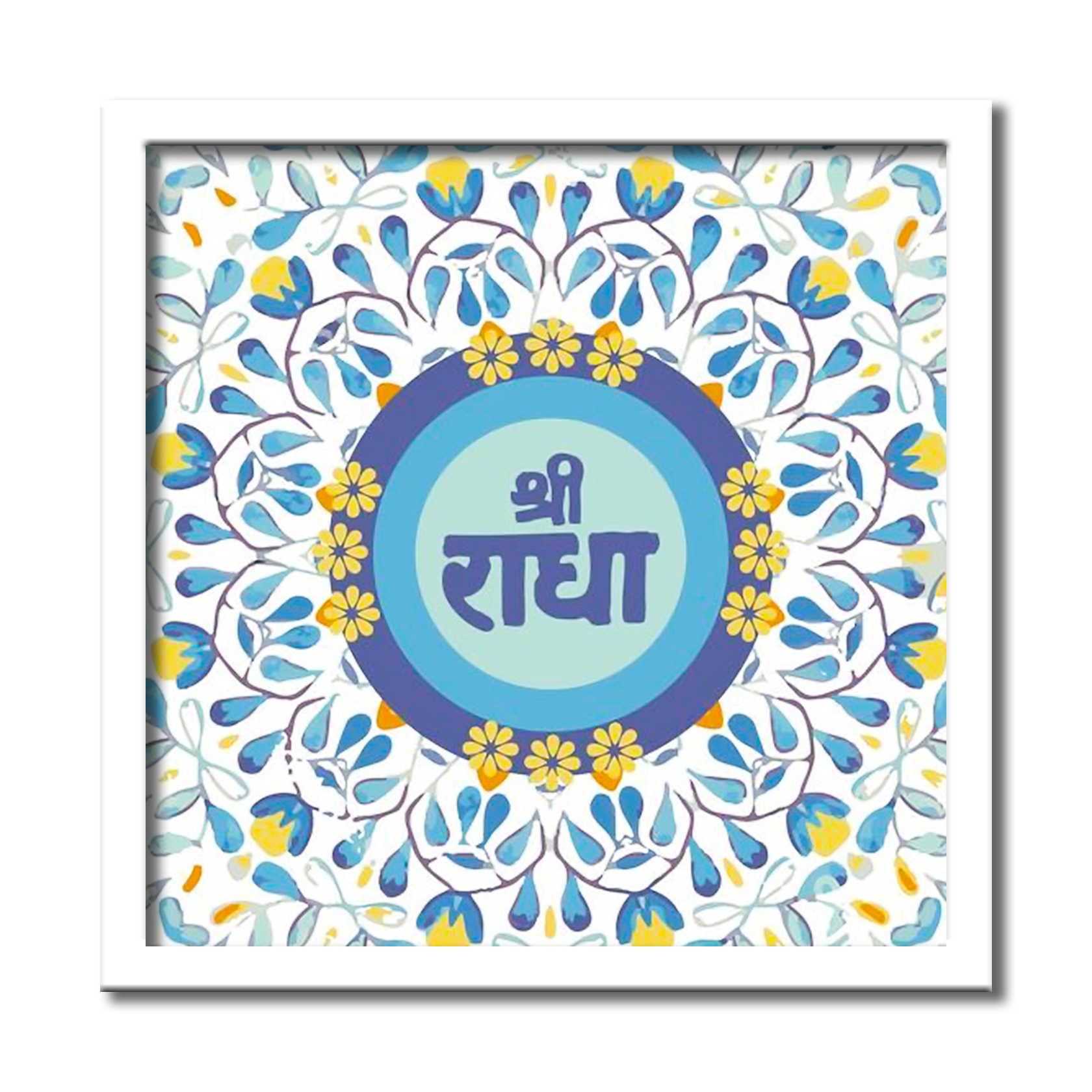 A serene mandala-style artwork featuring "Shree Radha" in elegant Devanagari script, surrounded by blue and yellow floral patterns. This peaceful design is perfect for spiritual websites, devotional art collections, or meditation and wellness platforms.