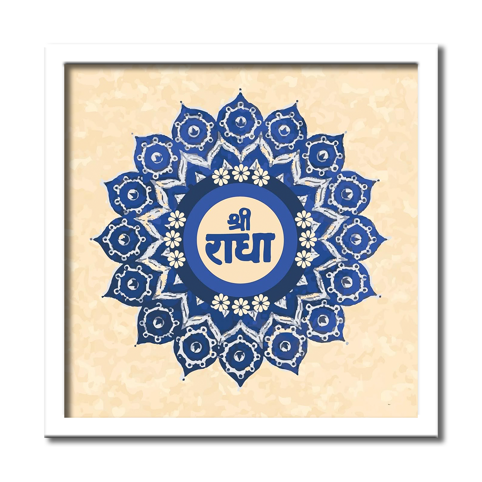 An intricate blue mandala design centered with "Shree Radha" in classic Devanagari script, set against a subtle beige background. This spiritual artwork radiates serenity and devotion—perfect for religious websites, meditation apps, or cultural art galleries.