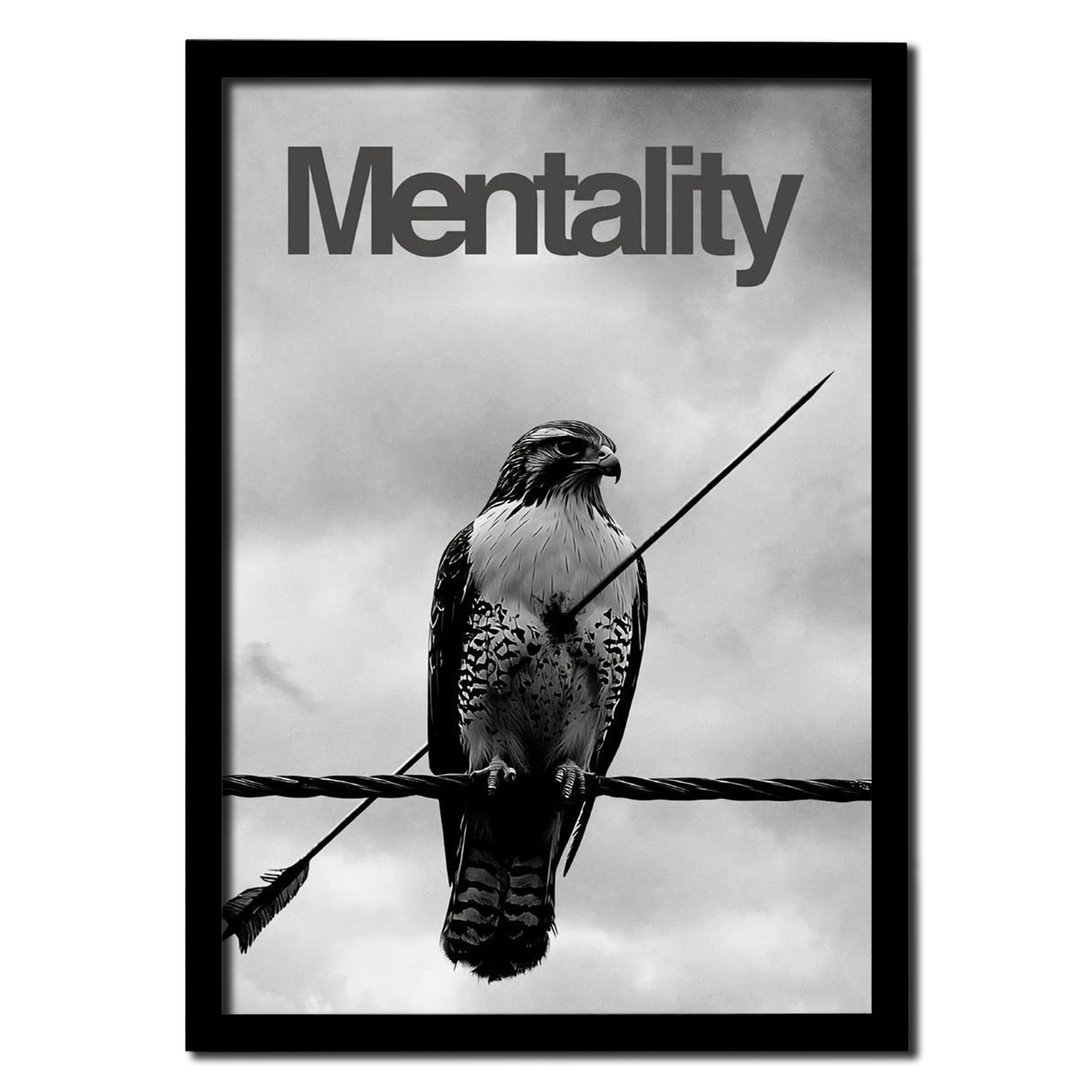 A powerful monochrome artwork of a hawk pierced by an arrow yet standing tall—symbolizing resilience, strength, and unshakable focus.